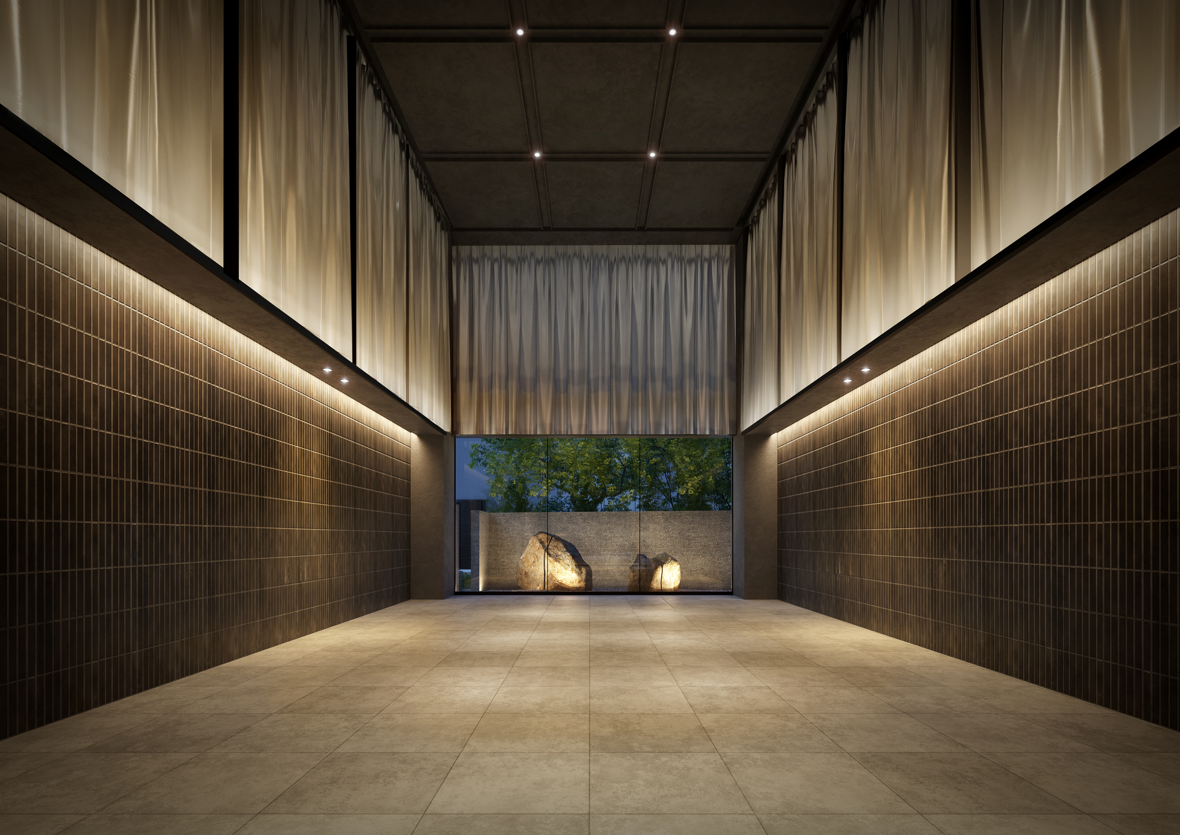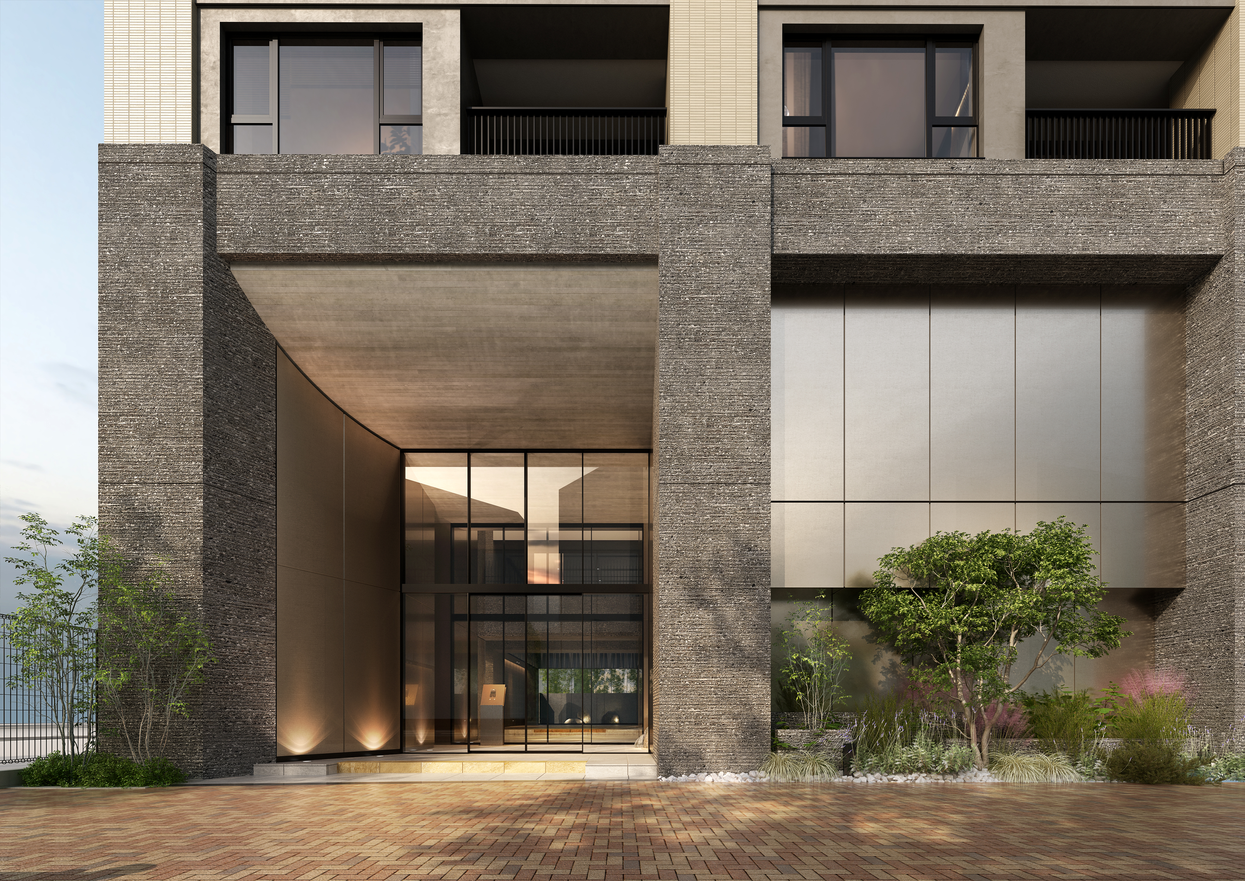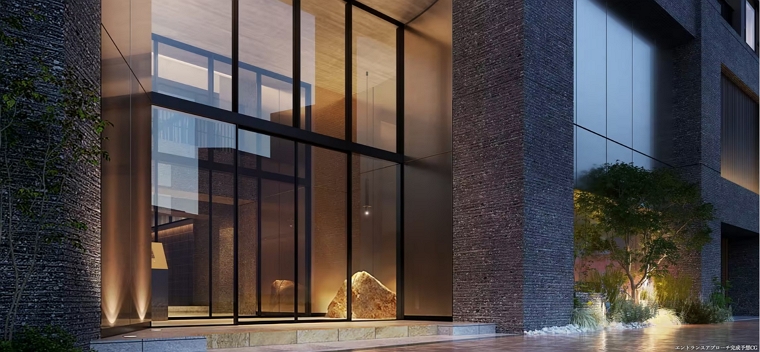 素材の陰影が、建築の輪郭に 揺るぎない気品を与える。 静けさを纏った立面は、街の輪郭をやさしく縁取る存在。 垂直に伸びるラインと深い陰影が織りなす造形は、日常に寄り添いながらも確かな個性を放ち、都市に溶け込みながらも静かに佇む美しさを宿します。 素材の持つ質感が光と呼応し、時間の流れを映し出すように、見る角度や季節によって表情を変えながら、住まう人の感性に語りかけるファサードが、この邸宅のはじまりを、静かに、そして力強く印象づけます。外界の気品と 静穏の領域を静かに分かつ境界。 街の喧騒と私的な静けさを、やわらかく切り替える“間”の空間。 アプローチから続く連なりが、訪れる人の心を整え、 一歩ずつ、日常から邸宅という特別な時間へと誘います。