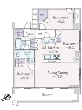 | 専有面積 | 73.43m² | バルコニー面積 | 13.36m² |